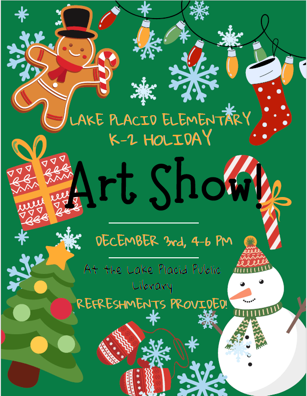 K-2 Holiday Art Show – with Lake Placid Elementary School Join us for the unveiling of this year’s holiday creations by our youngest artists. Refreshments provided for the opening celebration. The art will be on display through the month of December. + Add to Google Calendar + iCal / Outlook export Date Dec 03 2025 Expired! Time 4:00 am - 6:00 pm Share this event
