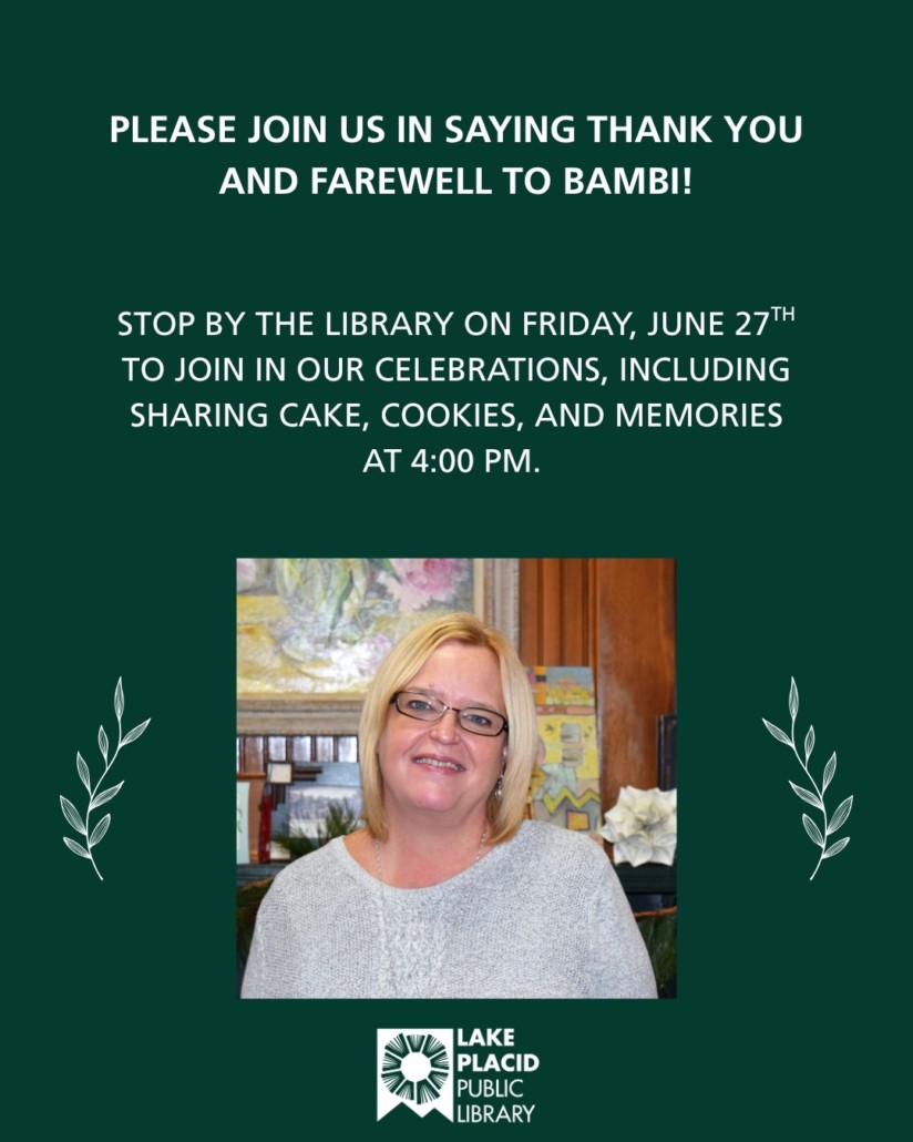 Please join us in giving Bambi a proper farewell! Bambi has been the Director of the Lake Placid Public Library for the last 10 and a half years. She is now moving on to her next big adventure!
